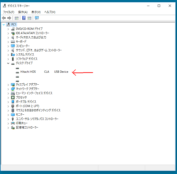ディスクドライブの項目を展開して、該当する外付けデバイス(赤い矢印の部分)を右クリッ